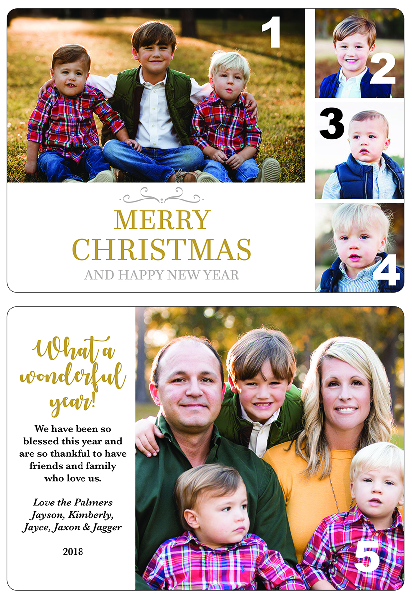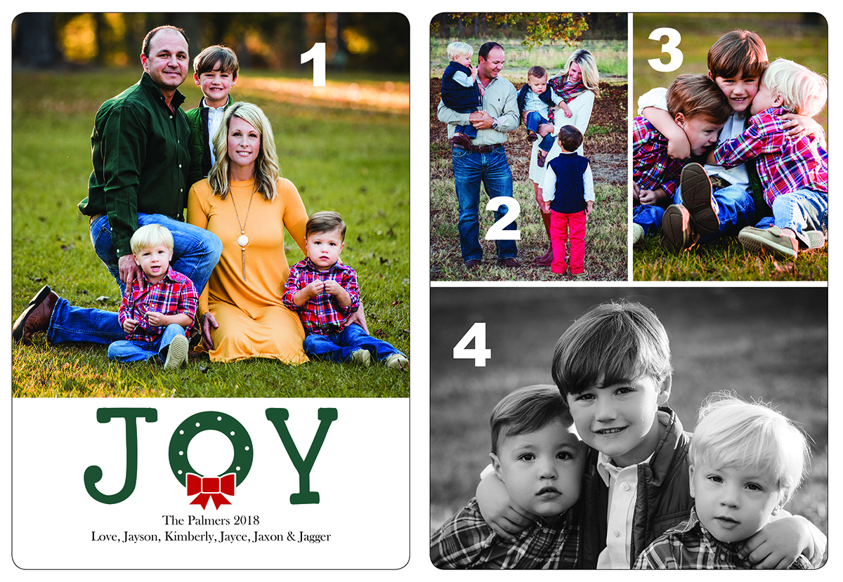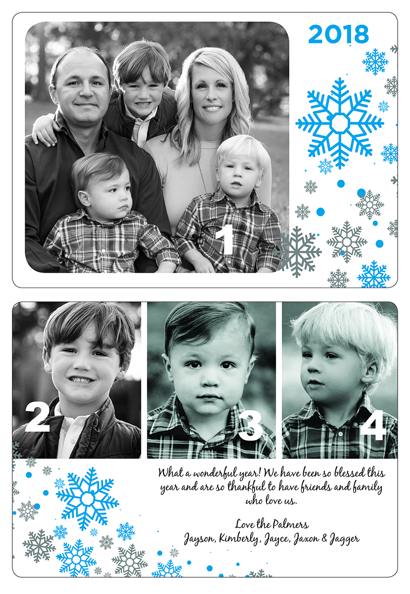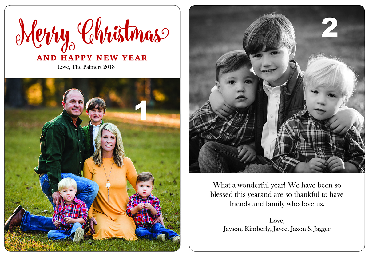 Share your family photos for the holidays with a photo card! Select from one of six templates, upload your photo(s), enter your text, submit payment and place your order! Each order includes blank envelopes.